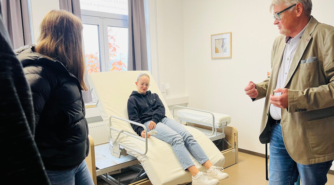 Im Health Lab standen anschließend technische Innovationen im Mittelpunkt, die den Pflegealltag erleichtern. Besonders beeindruckt zeigten sich die Jugendlichen von modernen Hilfsmitteln wie Bewegungssensoren, elektronischen Haustieren und einem Pflegebett, das Patientinnen und Patienten selbstständig in den Stand bringt. Große Begeisterung rief ein kleiner Pflegeroboter hervor, der in Einrichtungen zur Unterhaltung und Aktivierung von Bewohnern eingesetzt wird.