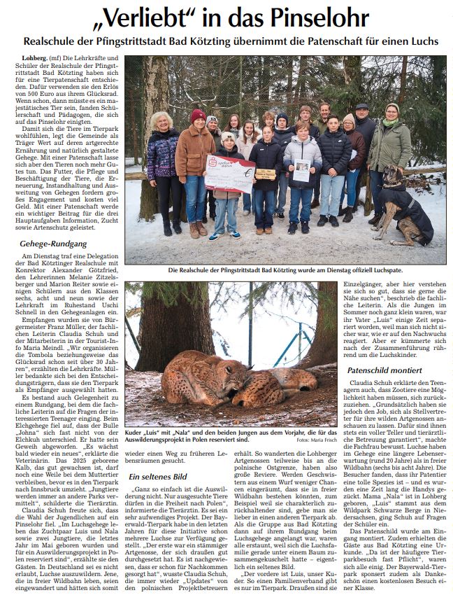 • Realschule der Pfingstrittstadt Bad Kötzting übernimmt die Patenschaft für einen Luchs